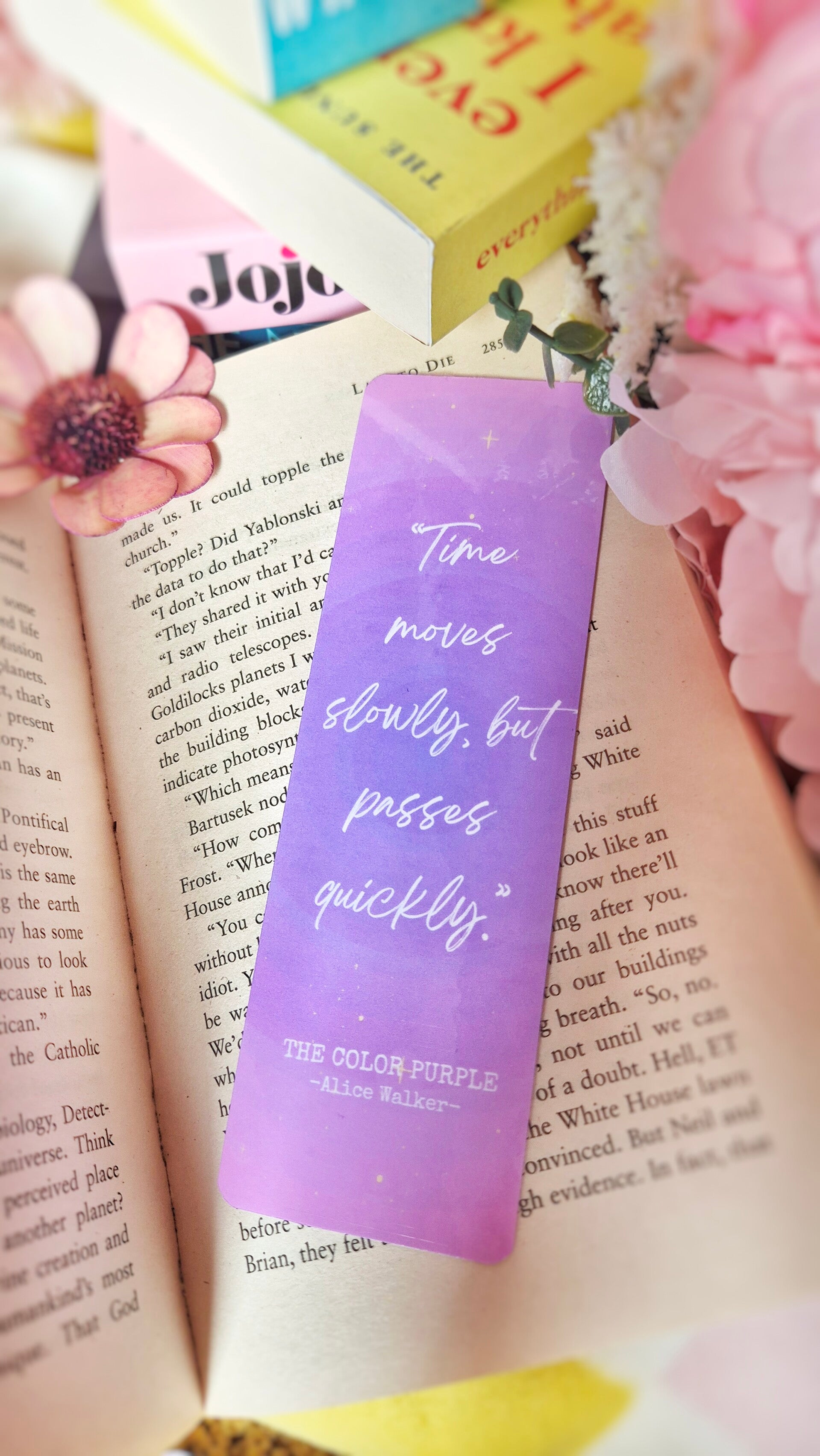 Immerse yourself in the profound wisdom of 'The Color Purple' with our Alice Walker quote bookmark. Featuring the thought-provoking quote 'Time moves slowly, but passes quickly,' this bookmark is an ideal companion for your reading journey. The elegant design complements any book and makes a perfect book gift or present for literature enthusiasts. Add this beautifully crafted bookmark to your collection and let it inspire every moment of your reading adventure!